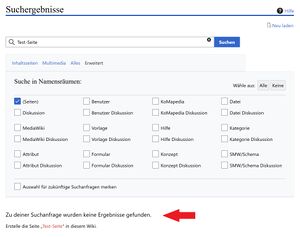 - Sollte die gewünschte Seite noch nicht existieren, so legt man eine neu an, indem man in die Suchleiste "KoMapedia durchsuchen" den entsprechenden Seitennamen eingibt. Es erscheint nun eine Seite mit den Suchergebnissen zur Suchanfrage, wie in Abb. 1 zu sehen. Klicke nun links vom roten Pfeil auf die in rot markierte Suchanfrage, hier "Test-Seite". Nun landest du auf einer neu erstellten Seite zu deinem Suchbegriff (siehe Abb. 2), die sich auch direkt im Bearbeitungsmodus befindet.
